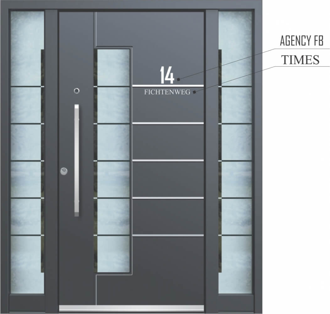 Siamo in grado di offrirvi un foglio di lamiera adesiva con colore RAL 9006 (per scritte su superfici più scure) o RAL 7016 (per scritte su superfici più chiare) su un lato. Il foglio è incollato all'esterno del pannello o del vetro. Può anche essere rimosso se necessario. Le scritte sono disponibili nei caratteri TIMES NEW ROMAN e AGENCY FB. Tutte le altre combinazioni su richiesta.