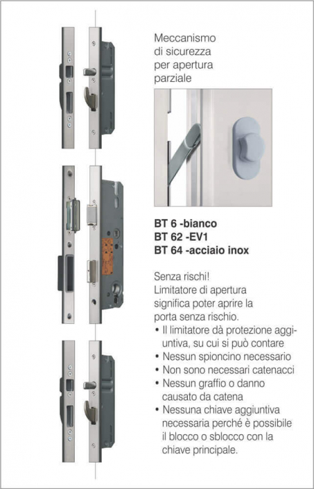 La sicurezza della tua porta e della tua casa è estremamente importante. Non vogliamo lasciare nulla al caso, quindi includiamo la nostra serratura a 5 punti anche nelle nostre dotazioni standard, garantendo il massimo livello di protezione anti-intrusione. Come puoi vedere, sono disponibili anche altri tipi di serratura di sicurezza: automatiche, con limitatore di sicurezza per l’apertura parziale e completamente motorizzate con meccanismo elettromeccanico.